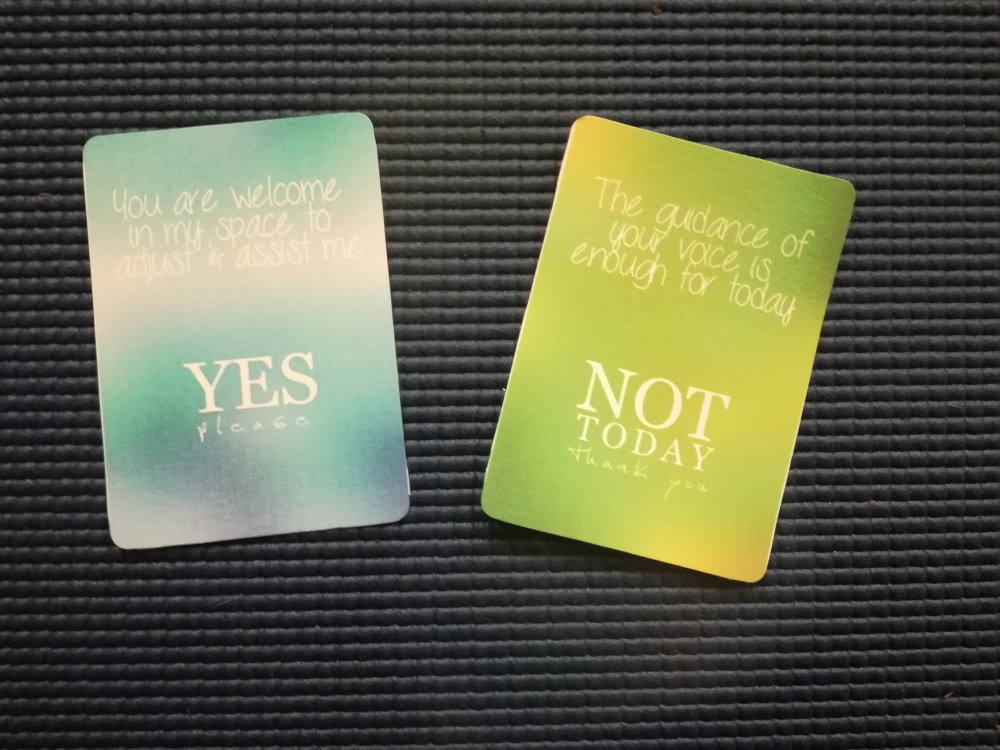 These are small cards that say yes or not to manual adjustment or assistance. They will be available throughout the class and can easily be slipped under the edge of a mat so I can see them as I walk around the class.