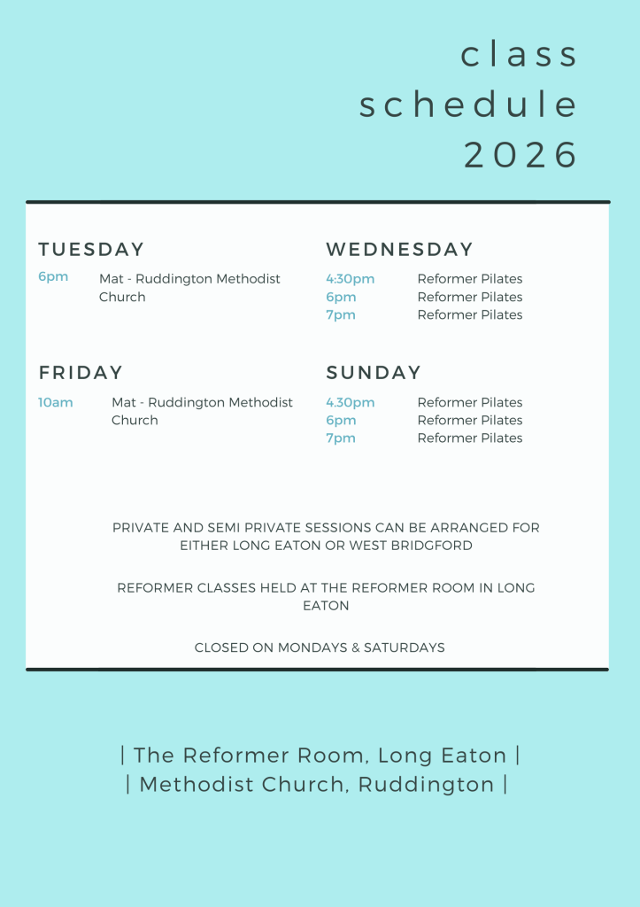 Reformer classes and private sessions are held at The Reformer Room, Unit 7 Harrington Mills, Leopold Street, Long Eaton, NG10 4QE